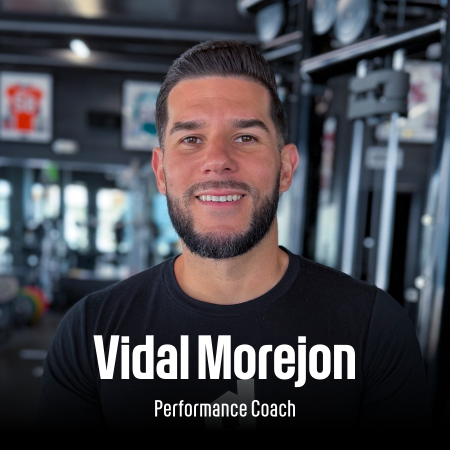 A man with dark hair and a beard smiling at the camera in a gym, wearing a black t-shirt that says 'Vidal Morcon Performance Coach'.