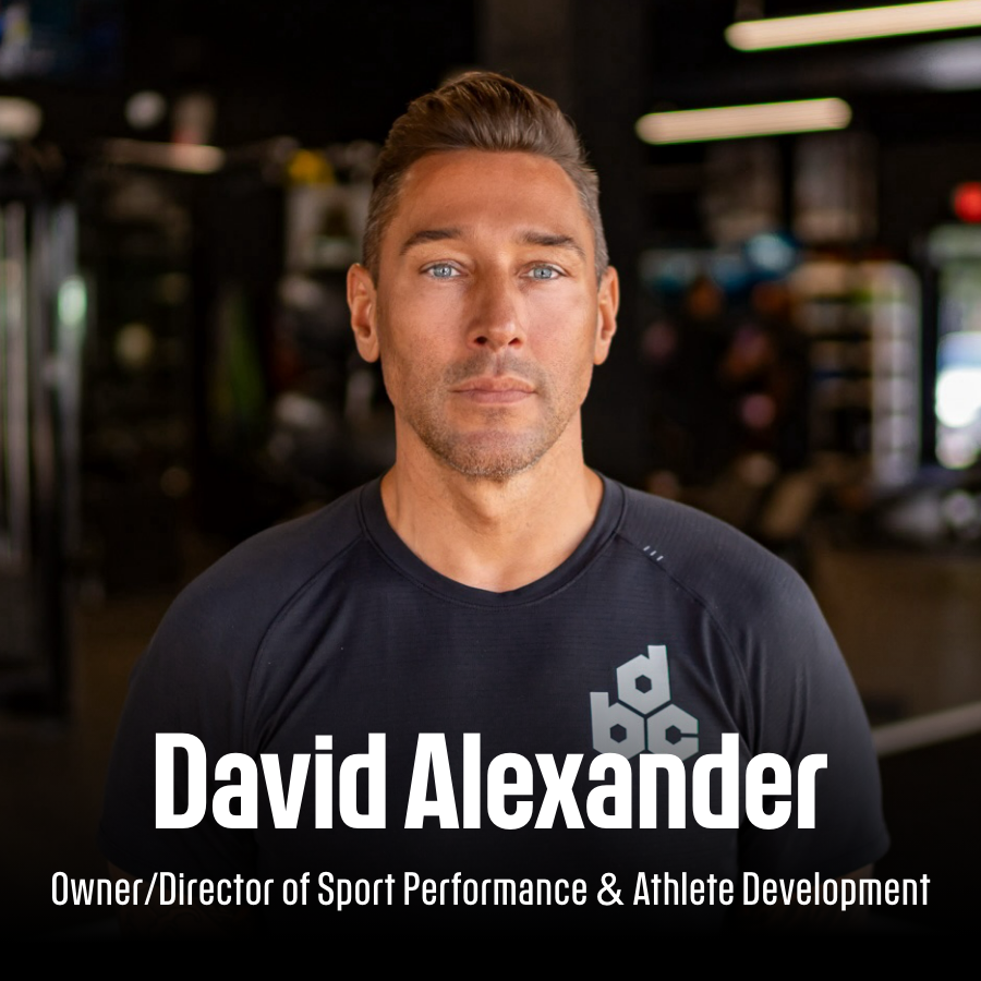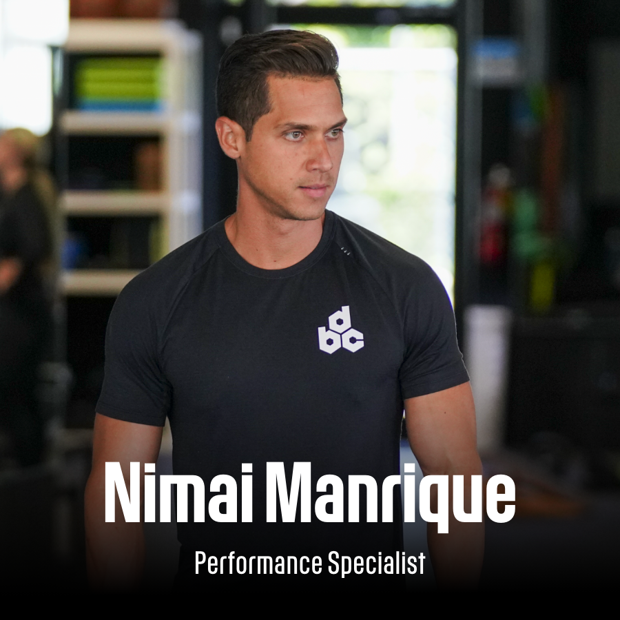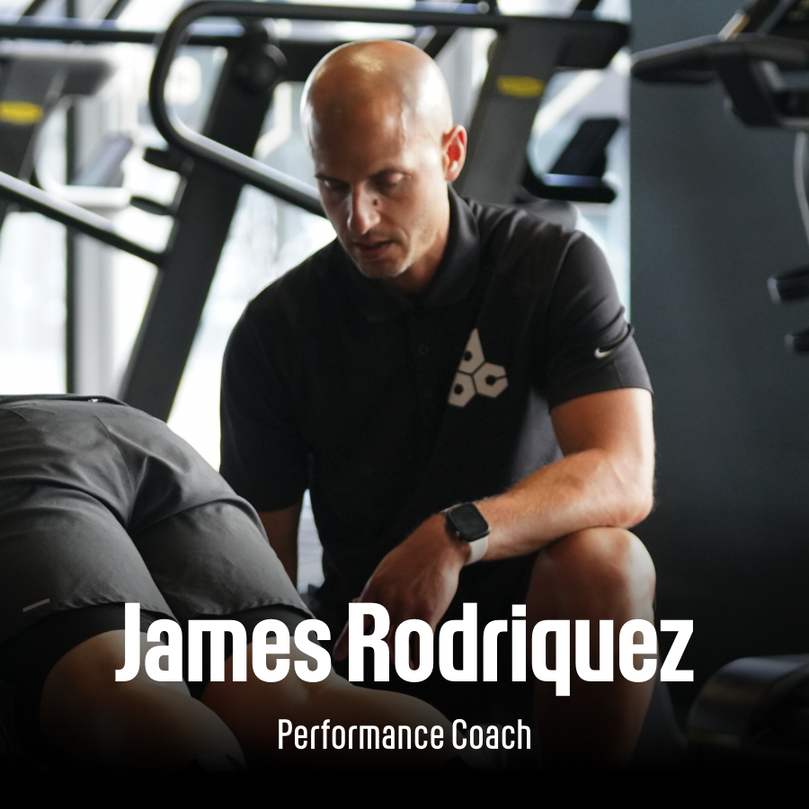 A bald man in a black polo shirt with a fitness logo, working closely with a person on the gym floor. The man appears to be a performance coach named James Rodriguez, as indicated by the text. Fitness equipment is visible in the background.