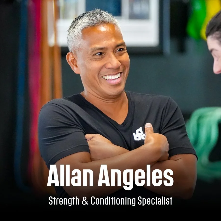 A smiling man with short gray hair, wearing a black shirt, crossing his arms in a gym or fitness setting. Text overlay reads: 'Allan Angeles, Strength & Conditioning Specialist.'