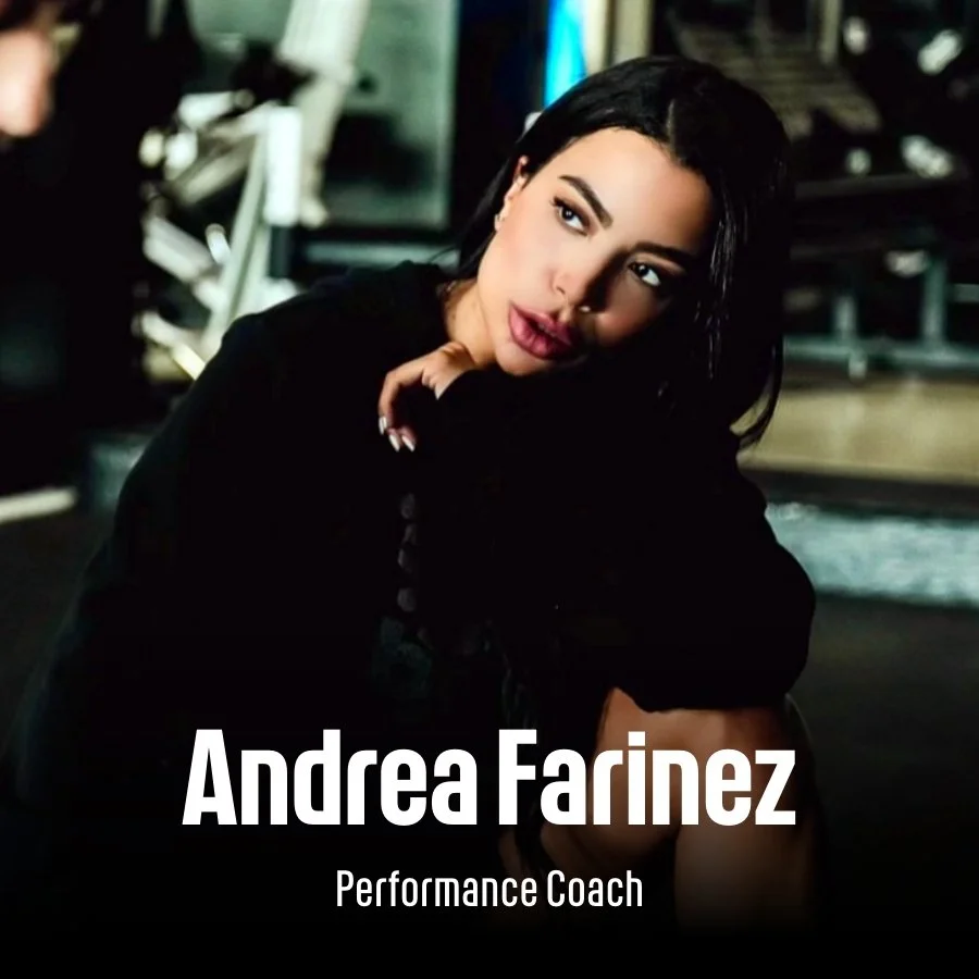 Portrait of Andrea Farinez, a performance coach, with dark hair and makeup, sitting in a gym or fitness center.